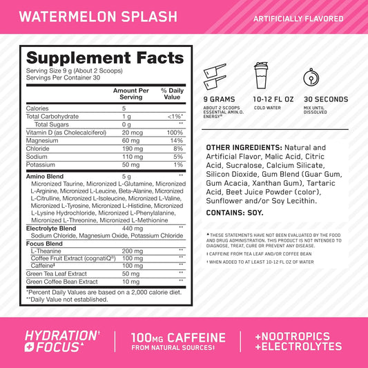 Amino Energy Powder plus Focus, with BCAA, Electrolytes, and Caffeine, Watermelon, 30 Servings (Packaging May Vary)